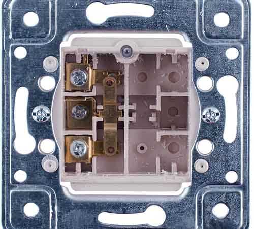 Если такой схемы нет, смотрите на клеммы (медные контакты в отверстиях): их должно быть три. Но далеко не всегда на недорогих экземплярах та клемма, что стоит одна — это вход. Часто они перепутаны. Чтобы найти где же находится общий контакт, необходимо прозвонить контакты между собой при разных положениях клавиши. Сделать это обязательно, иначе ничего работать не будет, а само устройство может сгореть.