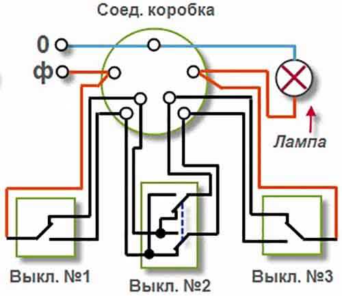 Схема электрическая включения лампы из трех мест.Чтобы подключить источник электрического света, согласно данной схемы, необходимо проделать следующие операции: