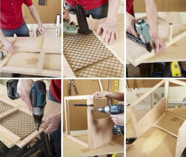 Обычно данный вид строения имеет такие элементы, как крыша, дверца, пол и стены. Для начала стоит изготовить опорную часть, при этом происходит сколачивание брусьев в виде параллелепипеда. Сетку разрезают на кусочки, из которых делаются стены и крыша.