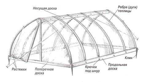 Устройство теплицы, чертежи и проекты дугообразных построек имеют свои особенности. Технические характеристики укрывающего материала накладывают ограничения на высоту каркаса. Завязано все на двух моментах: