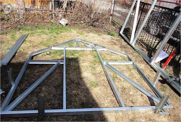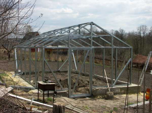 Сечение снова-таки зависит от размеров и природных условий. Чаще всего делают из прямоугольной трубы 20*40 мм. Но возможны и варианты. Для того материала важен еще такой параметр, как толщина стенки. Желательно чтобы металл был 2-3 мм. Такой каркас выносит значительные нагрузки.