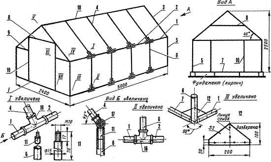 Пример каркаса теплицы из профильной трубы, чертеж с размерами и описанием деталей