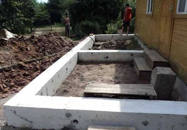 - Если почвы болотистые, предпочтителен бетонный фундамент — например, ленточный — который способен выдержать большую массу. Чтобы терраса при этом не ушла под землю, основание следует как можно надежнее привязать к фундаменту основного дома.