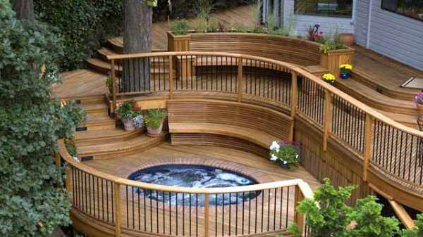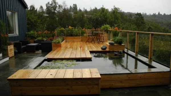 Искусственный водоем может быть надувным, сделанным из старой ванны, а также настоящим полноценным бассейном — смотря по финансовым возможностям владельца. На террасе часто устраивают зону барбекю, надежно изолировав деревянный помост от воздействия высоких температур.