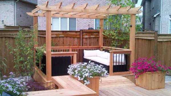 Площадку часто совмещают с перголами и беседками, соединяя их различными переходами, дорожками, ступеньками. Не редкость соединение летнего настила с бассейном.