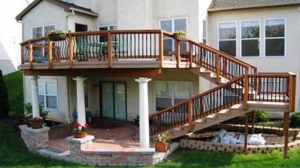 Двухэтажная терраса подходит двухэтажным домам, или строениям расположенным на склонах. Она обеспечивает удобный доступ к верхнему этажу, но ее высокие балки опор могут создавать нежелательный эстетический эффект. Пространство между опорами можно закрыть декоративной решеткой. Если уровень двухэтажной пристройки достаточно высок, можно декорировать угловые опоры камнем и использовать пространство под ней как дополнительную площадку на уровне земли.