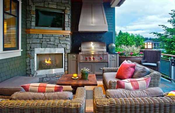 10. Летняя терраса круглый год. Обычно мы активно пользуемся отрытой площадкой в теплое время года. Мангал или камин позволят чаще использовать ее и в прохладное время года.