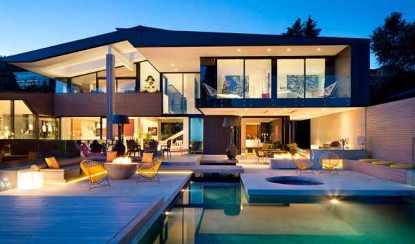 Терраса по периметру основного строения удобна по многим причинам. Если над ней устанавливается навес, то это позволяет дополнительно затенить помещения дома. Из каждого помещения, к которому примыкает терраса, может быть организован доступ на её территорию, что существенно повышает функциональность и комфорт проживания в таком доме. Например, около кухни на террасе можно организовать обеденную зону, а выйдя из спальни, можно оказаться в зоне отдыха под открытым небом. Выйдя из гостиной, можно сразу же очутиться на площадке около бассейна. Терраса с ограждениями может положительно повлиять на внешний облик дома и стать площадкой для дополнительного декорирования фасада, например, композициями из живых растений.