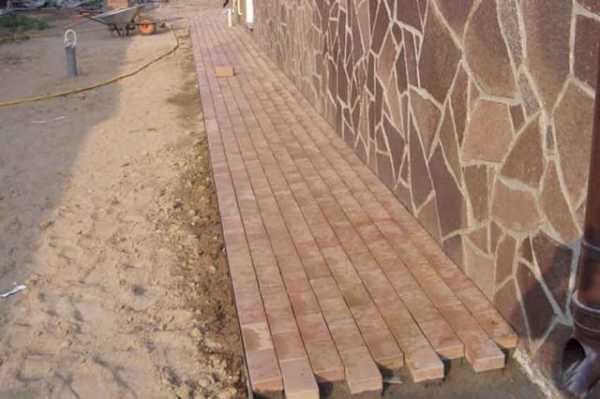 Важно! Учитывайте уклон отмостки. Также защитите рейки от гниения, обработав их битумной мастикой.