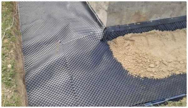 2. Поверх глины укладывается специальная пленка для обустройства гидроизоляции отмостки дома. Она закрепляется непосредственно на поверхности фундамента. Гидроизоляция укладывается с небольшим запасом, для этого по всей длине изоляции остается складка в 30-40 мм. Если вдруг отмостка отойдет от стен фундамента, запас будет служить своеобразным компенсатором. Запрещается использовать рубероид, так как это недолговечный материал.