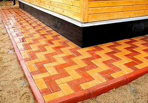 Брусчатка из бетона. Пожалуй, самый популярный материал для отмостки. Утепление отмостки, а также её гидроизоляция выполняется материалами для защиты фундамента. Форма, цвет и ассортимент по типоразмеру такой брусчатки позволяет выбрать её для отмостки любого размера. Толщина брусчатки — от 4 до 10 см, ширина — до 20, а в длину она может быть до 28 см. Её можно выложить орнаментом или простой кладкой, а щели утрамбовываются песком.