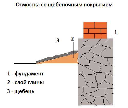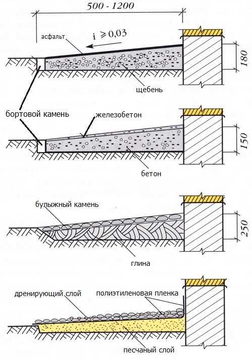Под щебенчатую конструкцию также предварительно выкапывают «корыто». Далее дно последнего тщательно утрамбовывают и выравнивают с уклоном. На следующем этапе в «корыто» насыпают глину слоем в 15 см. Укладывать этот материал следует также с небольшим уклоном по направлению от стены дома. Поверх глины в данном случае расстилается рубероид или толстая пленка ПВХ (с небольшим напуском на фундамент). Закрепить материал на поверхности цоколя можно, к примеру, рейками. Стыки рубероида проще всего проклеить битумом.