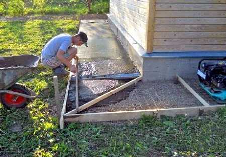 - Укладывается бетон, который должен быть достаточно густой консистенции, чтобы можно было легко сделать необходимый для отвода воды уклон.