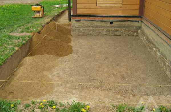 Отсыпается песчаная «подушка». Этот элемент «пирога» отмостки считается обязательным. Без «подушки» в последующем бетонная часть отмостки обязательно начнет растрескиваться. Толщина песчаного слоя в подложке должна быть равна 5-10 см.
