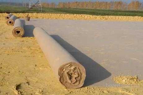4. По ширине отмостки стелится геотекстиль. Данный материал состоит из пропиленовой нитки. Он пропускает воду, причем предотвращает возможность песка заполнять пустоты между щебеночным слоем, который укладывается на песок.