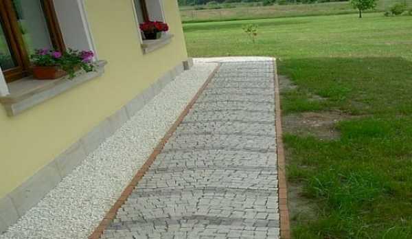 Ниже нами будут рассмотрены технологии устройства отмостки из тротуарной плитки и щебня, а также заливки ее из бетона.