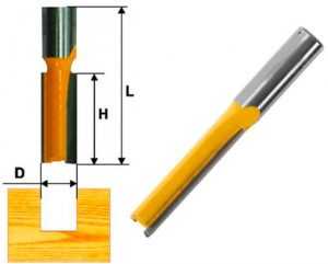 - прямая пазовая фреза. Обладает параллельными режущими кромками, которые во время вращения очерчивают собой поверхность в форме цилиндра. Эти фрезы предназначены для обработки прямых пазов. Ели умело сочетать их с копировальной втулкой, то получится аккуратно вырезать криволинейные плоские заготовки по шаблону. Размер этих фрез определяется диаметром и длиной режущей части