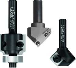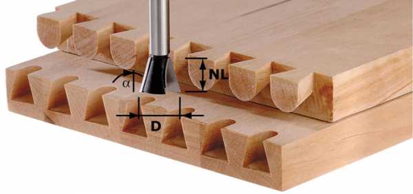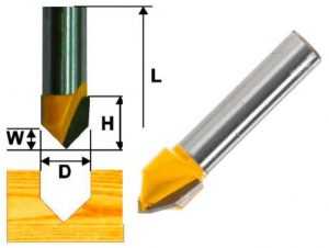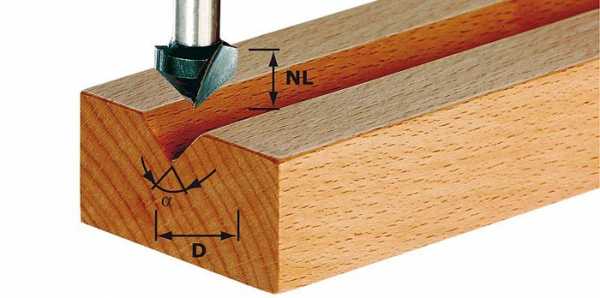 | Пазовые фрезы с V-образным торцом. При их использовании можно получить неглубокую канавку с боковыми стенки наклоненными по отношению друг к другу на угол 90°. Если работа предполагает изготовление пазов с разными углами наклона стенок, то надо иметь соответствующий комплект инструментов. | |||||