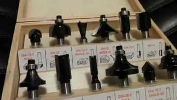 - во втором наборе содержится 12 фрез. Купив набор, вы получите две кромочные фрезы, имеющие радиус 6,35 и 9,5 мм и с опорным подшипником; одну фигурную с двумя радиусами 4 мм и с опорным подшипником; три концевые фрезы, имеющие диаметр 6, 12 и 16 мм; одну торцевую диаметром 12,7 мм; одну угловую (угол 90 градусов) с наружным диаметром 12,7 мм. Также в наборе присутствует одна пазовая фреза, имеющая радиус 6,35 мм; одна торцевая радиусная с радиусом 6,35 мм и опорным подшипником; одна торцевая фреза с углом 45 градусов с опорным подшипником, а также одна пазовая (под «ласточкин хвост»), имеющая диаметр торца 12,7 мм и угол 14 градусов. Такой большой набор станет верным помощником начинающему столяру, потому что он поможет реализовывать разные типы работ по созданию несложных предметов мебели