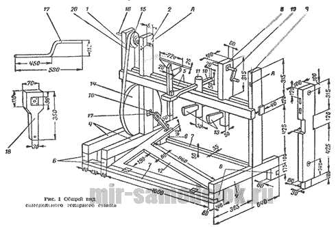 На нижних концах брусков, предназначенных для стоек 1, 2 и 3, сделайте шипы размером 100х80х30 мм На расстоянии 315 мм от верхних концов сделайте вырезы для параллелей 5 — 120 мм ширины и 25 мм глубины. На расстоянии 100 мм от верхних концов стоек 1 и 2 просверлите отверстия для шпинделя 16 и сделайте выемки для шарикоподшипников (по их размеру). На расстоянии 140 мм от нижних концов этих же стоек просверлите отверстия для оси маховика (коленчатого вала 17) и также сделайте выемки для шарикоподшипников, через которые будет проходить эта ось.