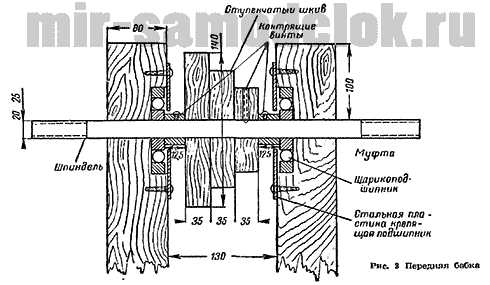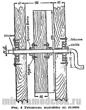Вложите в выемки на стойках 1 и 2 подшипники, поместите между стойками маховик и вставьте коленчатый вал. Не забудьте надеть на него две стальные пластинки для закрепления подшипников. Укрепите контрящим винтом маховик и проверьте, вращается ли он строго в одной плоскости, не перекошена ли ось Перекос оси можно устранить, расклинивая подшипники маленькими гвоздями. Когда достигнете правильной центровки оси с маховиком, закрепите подшипники стальными пластинками, а вал — двумя металлическими муфтами с контрящими винтами или шпильками. Под них тоже нужно подложить шайбы.