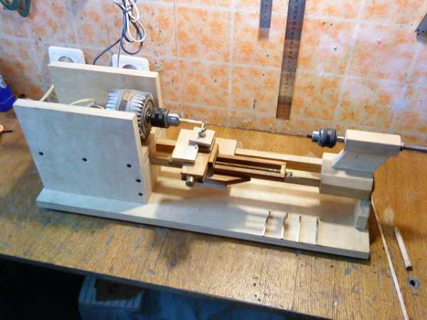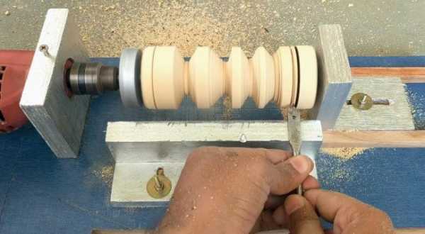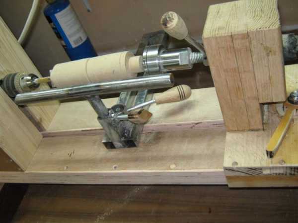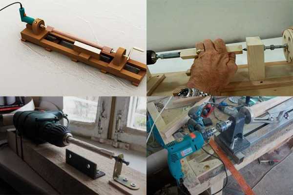 Существует множество вариантов изготовления подобного токарного станка, они отличаются сложностью, используемыми материалами. В самом простом случае станок представляет собой доску или кусок толстой фанеры, на одном конце которого установлен упор для дрели с фиксатором, на другом – задняя балка: брусок с валом внутри. В качестве вала можно использовать заточенный винт или дюбель подходящего диаметра.