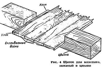 Диаметр маховика 14 — 570 мм, ширина 95 мм (возможны и другие размеры). Для изготовления маховика надо подобрать и хорошо выстругать сухие доски толщиной 20—25 мм и склеить из них три или четыре (в зависимости от толщины досок) квадратных щита. Для склеивания щитов понадобятся так называемые цвинки — те же струбцины, но более длинные. Сделайте их из брусков. Вложите в две цвинки доски, предварительно смазав их ребра (кроме наружных) горячим столярным клеем, и зажмите двумя клиньями, заколачивая их один навстречу другому. Все это показано на рисунке 4