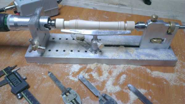 Это несложно. По большому счету достаточно зафиксировать дрель на станине, а напротив нее установить заднюю бабку, она должна быть подвижной, что позволит регулировать рабочее расстояние.