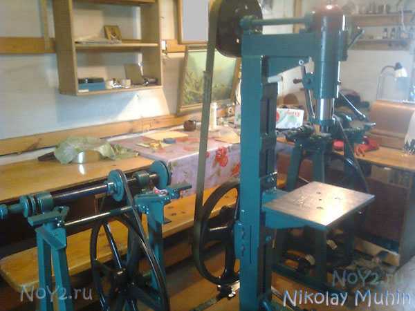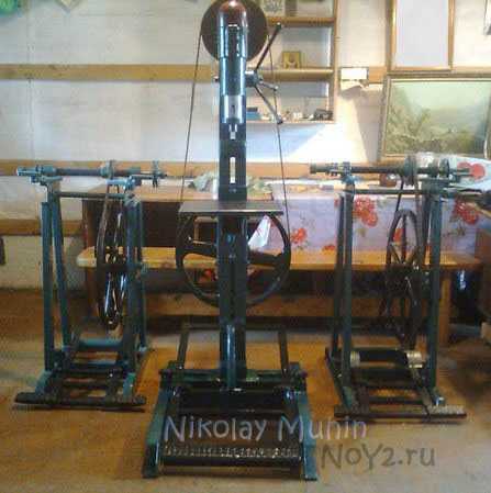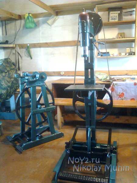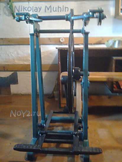 У Николая есть и примеры исполнения Мускульных (Мускульно-приводных или Ножных станков, а иначе — механических станков с мускульным приводом) комбинированных из металла, с деталями рам из дерева.