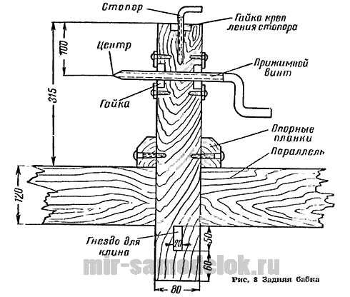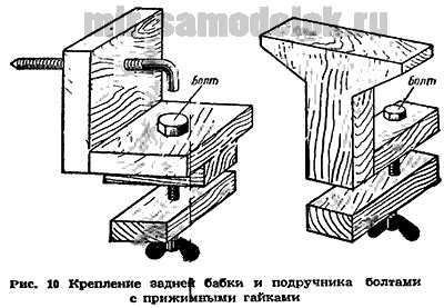 Для того чтобы задняя бабка была более устойчивой, привинтите к ней две опорные планки. А чтобы прижимной винт не мог отойти во время работы, приделайте стопор из выгнутого толстого гвоздя или стального прутка с нарезкой и гайкой Все эти части задней бабки показаны на рисунке 8.