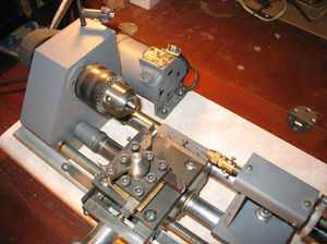 Передняя бабка выточена на токарном станке, надета на вал двигателя и закреплена винтом. Спереди накручена гайка-барашек. Получился своеобразный трезубец.