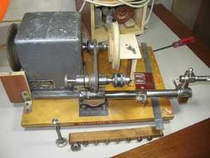 Устройство такого станка отличается крайней простотой. В качестве электрической составляющей отлично подойдет двигатель от старого магнитофона, запитанный от внешнего блока питания. Станиной мини-станка послужит отрезок доски необходимой длины.