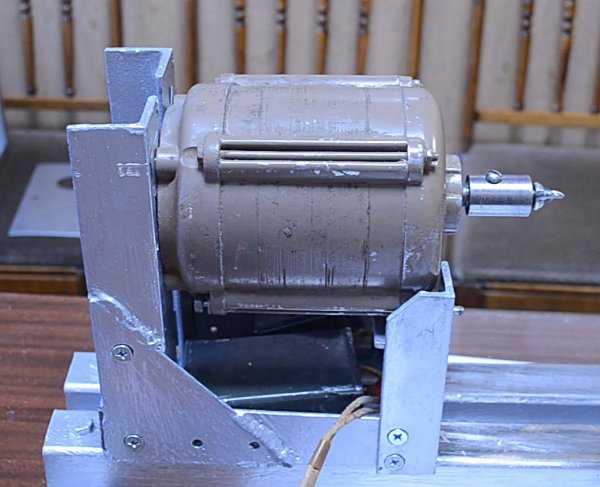 Двигатель необходимо закрепить. Конечно, для маленького станка ременная передача не годится, заготовку придется крепить на вал двигателя. Лучшее приспособление для этого – планшайба. Корпус привода – П-образная пластина, в центре которой просверлено отверстие под вал. Двигатель в корпусе с помощью саморезов крепится на станине.