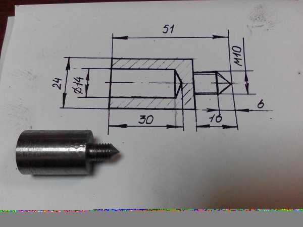 Под пиноль выточить полый цилиндр с глухой торцевой стенкой, в которой нарезана резьба под винт маховика. Подвижная часть пиноли — это цилиндр с коническим отверстием и шпоночным пазом на всю длину. Перемещается подвижная часть при помощи винта маховика по шпонке, приваренной в корпусе бабки.