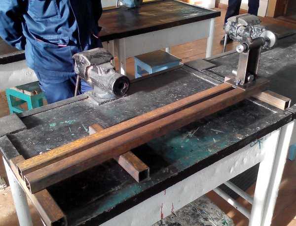 Передняя бабка самодельного токарного станка.В качестве станины и направляющих использовалась труба квадратного сечения. Длина направляющих составляет 1 метр. Расстояние между направляющими — 2 см.