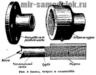Лучше, если шпиндель сделан из трубы. В этом случае планшайбой может служить фланец, навинчивающийся на трубу. В качестве патрона удобно использовать соединительную муфту, так называемую «переходную» — с разными диаметрами. Вилку легко сделать из короткого отрезка трубы,» ввинченного в муфту до половины; конец ее нужно сплющить и обработать напильником по рисунку 9.