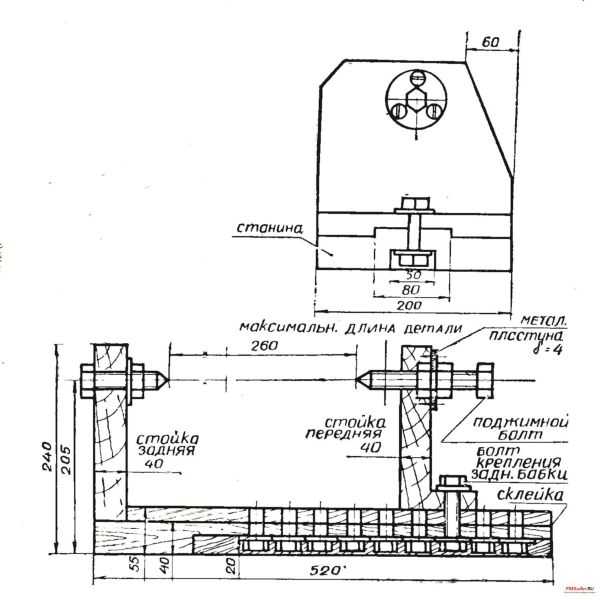 Применяются доски 40 мм; станина склеена столярным клеем и свита гвоздями; для перемещения задней бабки вывернуть болт.