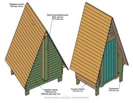 - Когда каркас готов, делается обшивка из досок толщиной 15−25 мм. Для этого могут понадобиться дополнительные перекладины на каркасе. Доски располагаются вертикально и плотно подгоняются друг к другу. Обшивая боковые стенки, необходимо верхнюю часть досок обрезать под углом, позволяющим установить крышу с наклоном. Крышу можно покрыть тем же материалом, что и остальные строения на участке, или сделать из досок, подложив под них рубероид или другой гидроизолирующий материал.