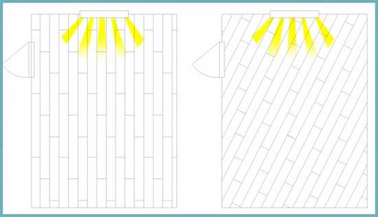Наиболее распространенная схема укладки покрытия – прямая: она экономична, т. к. отрезанная часть доски предыдущего ряда используется в качестве начала следующего. Покрытие следует укладывать вдоль направления света, тогда стыки элементов будут менее заметны.