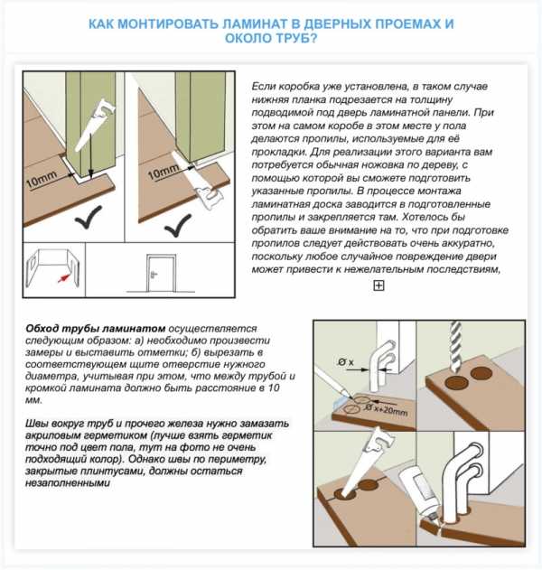 Для подготовки к монтажу вокруг труб вырезают отверстия диаметром на 1 см больше диаметра трубы. Место стыка с трубой закрывают специальной ламинатной накладкой либо заделывают отверстие клеем/шпатлевкой. Оптимальный вариант – сначала шпатлевка, сверху накладка.