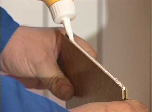 Перед тем, как начать укладывать начальный ряд панелей, следует подготовить специальный клей для ламината и ввести необходимое количество клея в торцевой паз первой панели в ряду. При этом необходимо подбирать количество вводимого в паз клея так, чтобы паз был полностью наполнен клеем. При этом после соединения двух ламинатных панелей клей не должен проступать наружу. Если он все-таки проступил, его излишки удаляются с помощью шпателя.