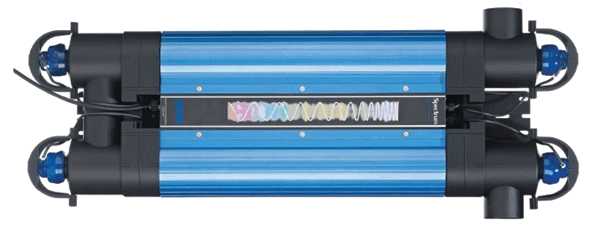 Вода пропускается через длинный канал малой площади сечения, подвергаясь продолжительному УФ-воздействию. Данная конструкция обеспечивает высокую степень обеззараживания воды и исключает образование на стенках прибора солевых отложений, препятствующих процессу дезинфекции. В комплекте предусмотрены кронштейны для крепления на стены бассейна.