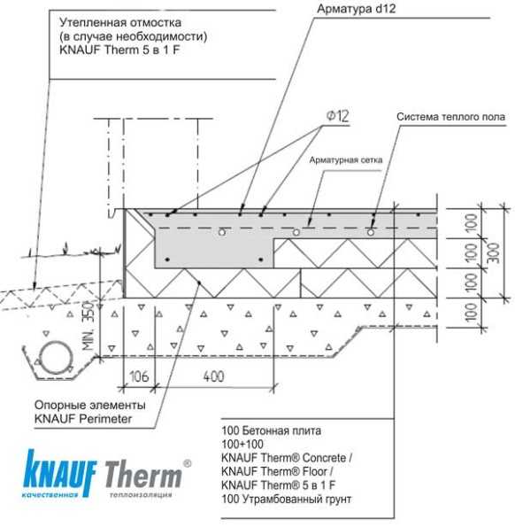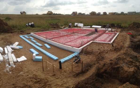 - Утепление самой плиты и отмостки вокруг дома, убирает явления морозного пучения, которые могут стать большой проблемой для более традиционных лент и плит.