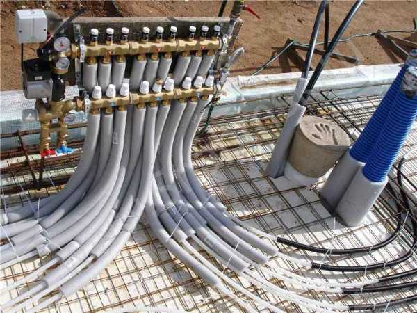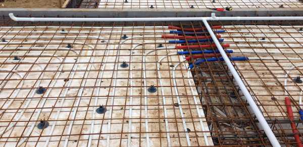 Стальным прутом диаметром 10 мм армируются зоны нагрузки, из нее сваривается решетка с ячейкой 15 см. Ее делают с таким расчетом, чтобы защитный бетонный слой составил не менее 30 мм. На сетку укладываются трубы системы теплый пол, крепятся к ней хомутами. В местах, где будут ребра жесткости, трубки помещаются в гильзы из более прочного материала. Распределители системы выводятся и укрепляются на забитых вертикально прутьях. Систему теплый пол заполняют теплоносителем, проверяют ее герметичность под давлением.