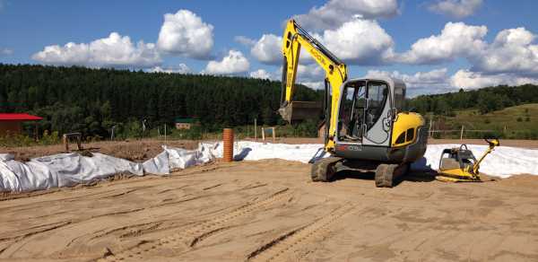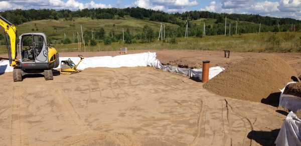 Дно засыпается слоем чистого песка толщиной 15 см, его утрамбовывают, периодически поливая водой для большего уплотнения. На подготовленную поверхность укладывается геотекстиль, при этом полотна на 30 см должны выступать за пределы фундамента. На материале обустраивается дренаж. Для этого на него высыпается слой гравия или щебня фракции от 20 до 40 мм, его толщина достигает 15 см. Иногда это делается в несколько слоев, каждый слой пересыпается песком. После формирования подушки, выступающие края геотекстиля оборачиваются вокруг нее.
