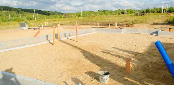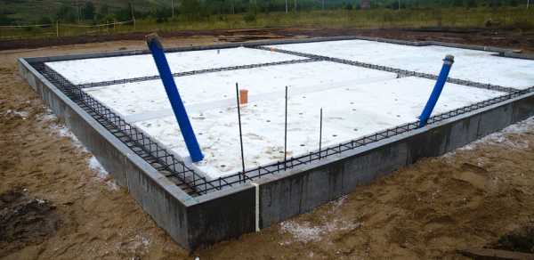 Перед бетонированием выводят и заглушают все инженерные системы, после форму УШП фундамента заполняют бетонным раствором. Погружным вибратором уплотняют смесь, следят за тем, чтобы не образовывалось пустот, особенно возле арматуры. Поверхность монолита тщательно выравнивается и накрывается полиэтиленом. Это обеспечит равномерное твердение раствора, позволит избежать его растрескивания. Летом его нужно периодически поливать водой.