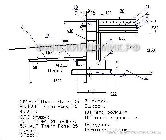 Если УШП у нас, это корыто с пенопластом бетоном и теплыми полами, то УФФ — это утепленная лента с «пяткой», выполняющей опорную и несущую роль, с обратной засыпкой хорошо утрамбованным грунтом, и хорошо утепленной стяжкой с теплыми полами. Вариантов таких лент есть много, я приведу схему от финского домостроительного концерна Оматало (Финндомо)