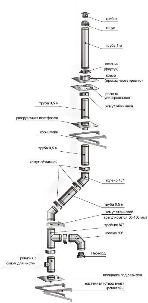 Все элементы, для сборки дымохода, указаны на схеме.