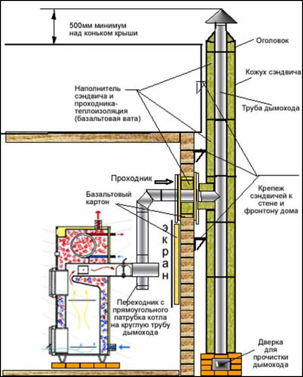 - если дымоход расположен вне дома, то он весь должен быть изолирован теплоизоляционным материалом. При внутренней прокладке утепляются только наружные элементы.