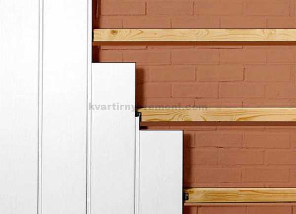 Для обрешетки выбираем специальные металлические профили (более дорогой вариант) или деревянные бруски, примерно 10х30. Верхний и нижний крепим поближе к потолку и полу соответственно, а в середине придерживаемся разумного расстояния, около 30см. При таком расположении брусков панели пвх будут достаточно жестко держаться.